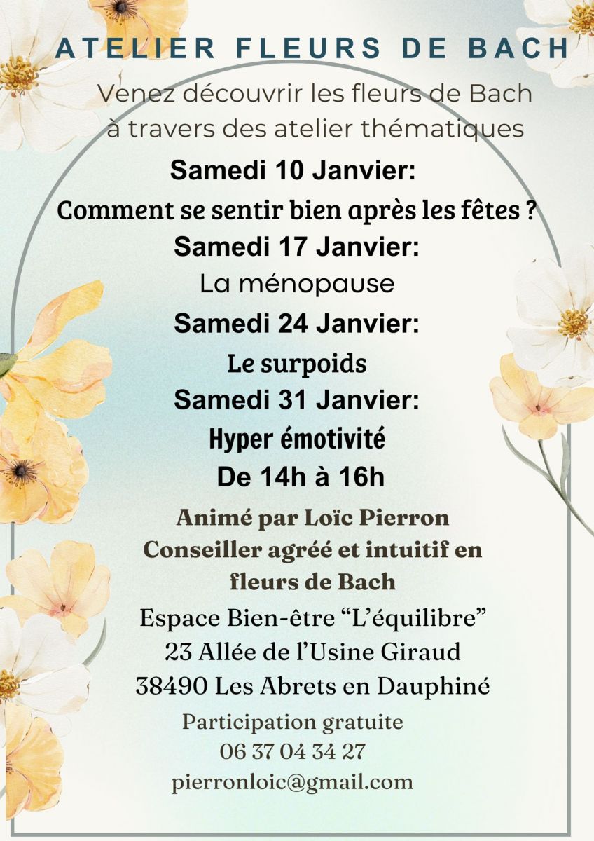 RDV tous les samedis de janvier pour des ateliers Fleurs de Bach avec Loic Pierron (Conseiller en FDB, centre l'Equilibre Les Abrets)